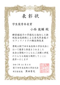 小西俊輔さんが第77回日本生物工学会大会にて学生優秀発表賞を受賞しました