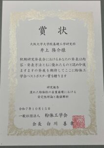 井上隆介さんが粉体工学会2025年度秋季研究発表会にてBP賞を受賞しました
