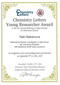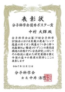 中村大輝さんが第19回分子科学討論会にて分子科学会優秀ポスター賞およびChemistry Letters Young Researcher Awardを受賞しました
