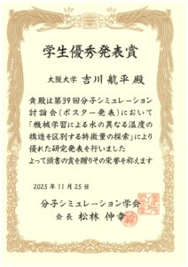 吉川航平さんが第39回分子シミュレーション討論会にて学生優秀発表賞を受賞しました