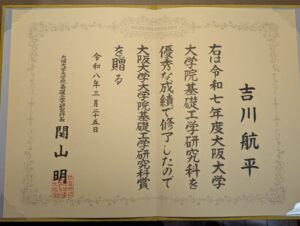 受賞Award HOME受賞吉川航平さんが大阪大学大学院基礎工学研究科賞を受賞しました 吉川航平さんが大阪大学大学院基礎工学研究科賞を受賞しました 2026年3月25日 3月25日に12期生の吉川航平さんが令和7年度大阪大学大学院基礎工学研究科賞を受賞しました。