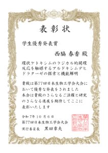 On October 6th, NISHIWAKI Haruka won the Student Presentation Award at The 77th Annual Meeting of the Society for Biotechnology, Japan.