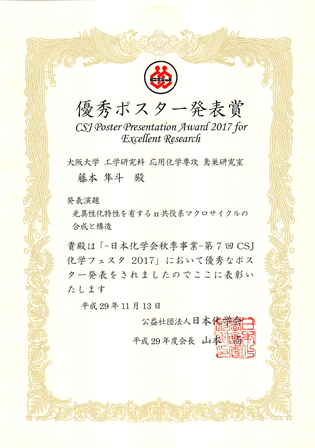 Award HOMEAwardHayato Fujimoto won the CSJ Poster Presentation Award 2017 Hayato Fujimoto won the CSJ Poster Presentation Award 2017 2017.10.19(Thu) Hayato Fujimoto won the CSJ Poster Presentation Award at 7th CSJ Chemistry Festa 2017.